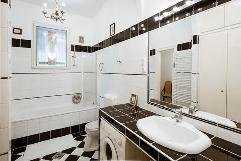 The shine of the handrail, the original Bauhaus silver door handles, the marquetry on the bookshelf, the hundred years old chandeliers, the original Bieder and Art Deco chest of drawers, the old Petroff pianino transformed into a work table, the noble wood parquet floor, the black and white diagonal Bauhaus sytle tiles, or the stained glass of the bathroom created by the same team who worked in the Grasham Four Season's Hotel makes this apartment unique.